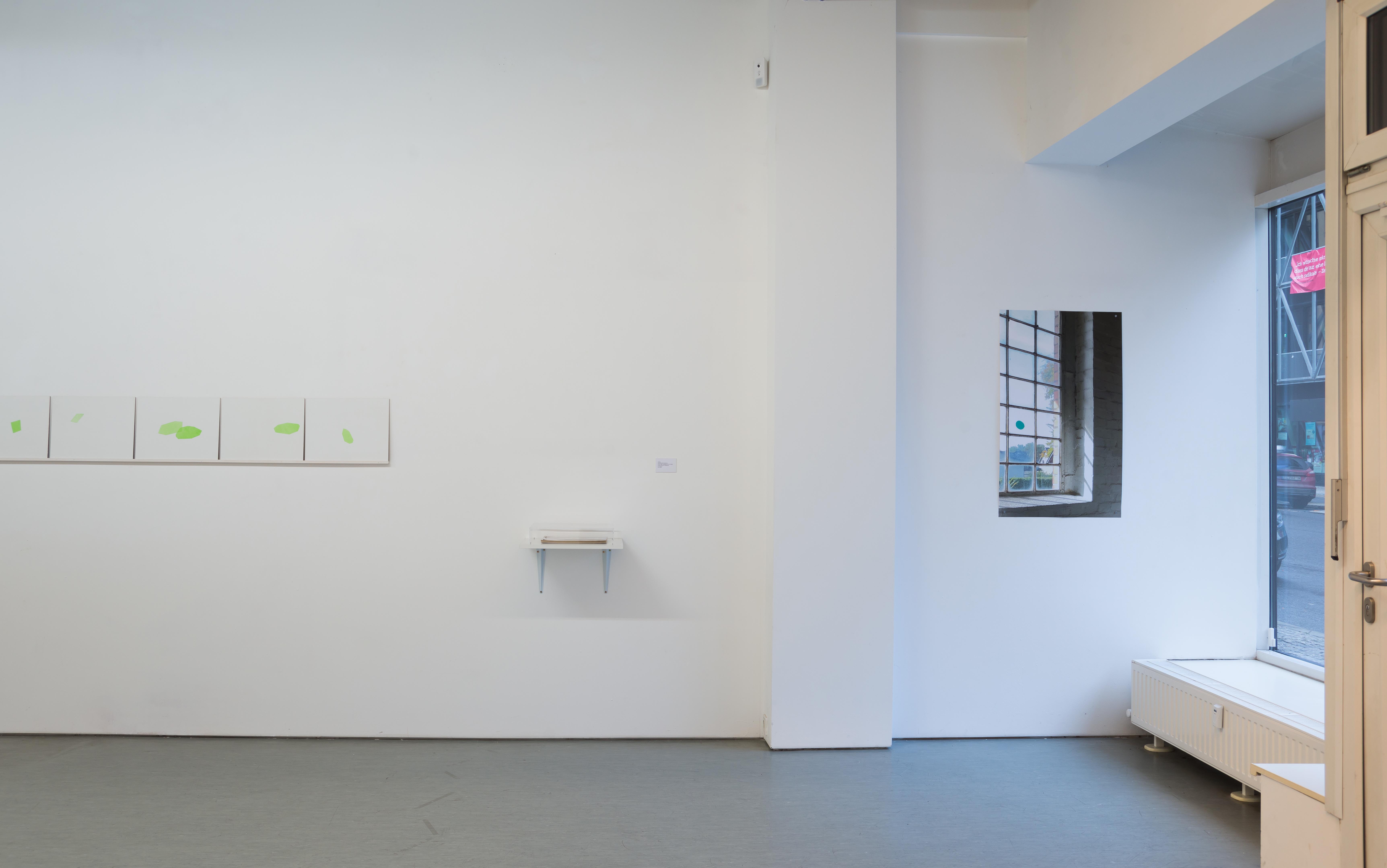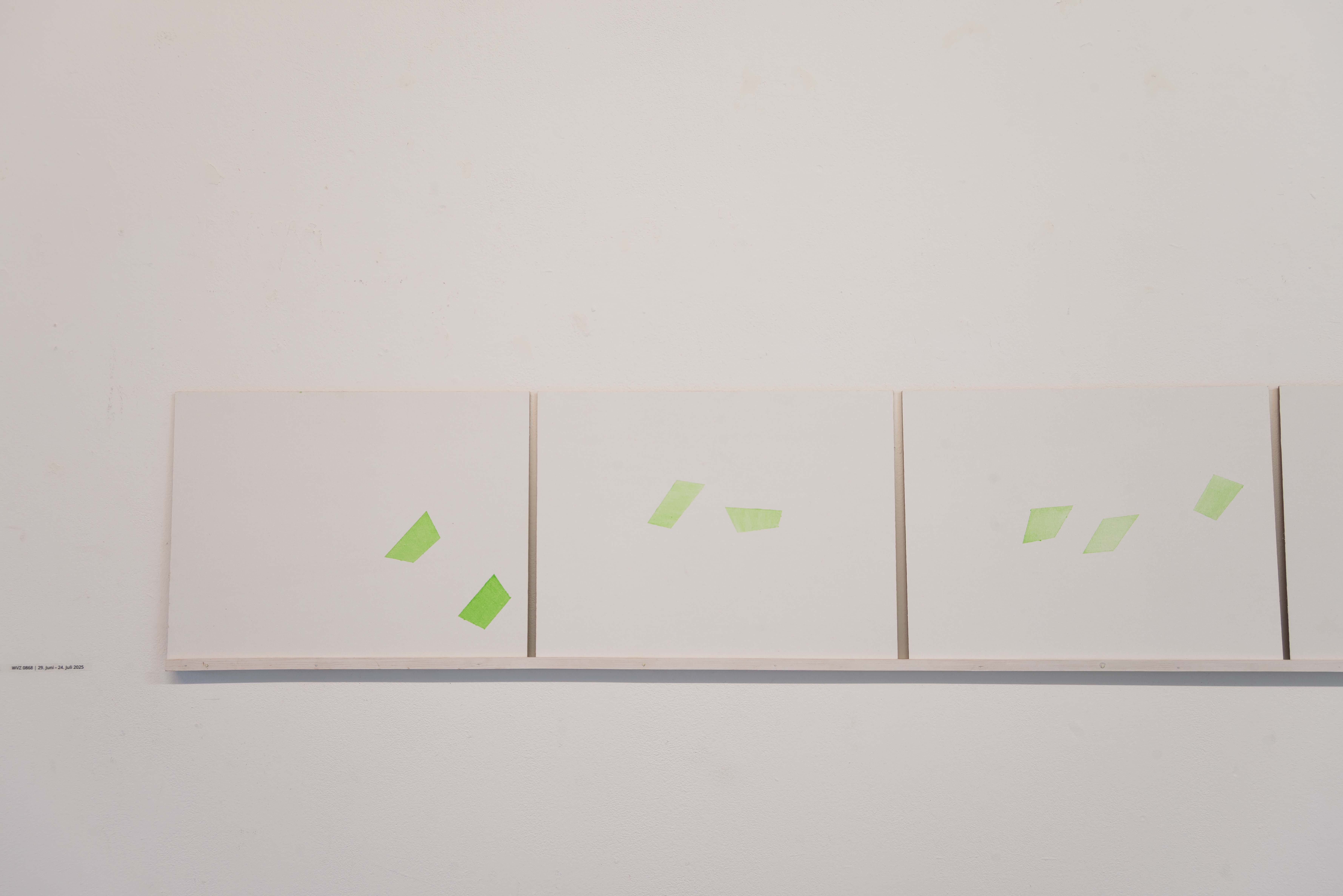 At my studio window in Schönwalde I attached a small round green foil that I cut to size. Since March 2024, 1 have been observing what the sun projects (paints) through this foil onto my canvas walls. 1 first outline the resulting shapes with strips of crepe and then paint them with slightly transparent green paint. 1 note the respective dates and times on the back of the picture. The results are delicate works that shimmer like sunlight. Five chronologically consecutive pictures from the series are archived together in a box, and the series is continually expanded, with 54 pictures having been created by the end of 2024.