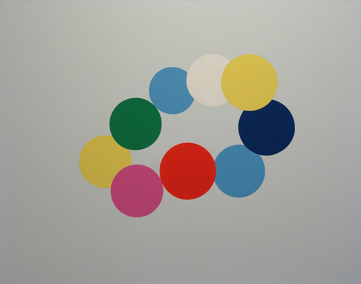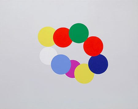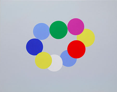 The Circle of Color (2008) series is based on the eight basic colors red, yellow, green, cyan, blue, magenta, as well as (neutral) black and white. In an additive and subtractive color system white and black respectively emerge at the point of intersection of these colors. In line with the diagram-form portrayal of these systems individual circles are superimposed on each other in his works, all of which, in turn, are configured in a circle. Their colors, however, are opaque. Even though the individual shapes are not structurally modeled, as opposed to scientific portrayals of color circle systems they are presented in a spatial depth perspective, similar to a molecular structure. This appearance, however, is deceptive, as the superimposition of the individual circles in the depth of the picture does not correspond with their position in perspective. Also, on closer observation, the color of the circles does not correspond exactly with the basic colors. In Vogel’s color system some hues are even used several times. As such, attempts by the observer to detect a logical structure to the colors and geometric shapes fail. This is not a scientific analysis, actual images are being created here. Yet again in his works Matten Vogel hinders clear legibility and makes the controlled strategy of negation the focus of his artistic output.