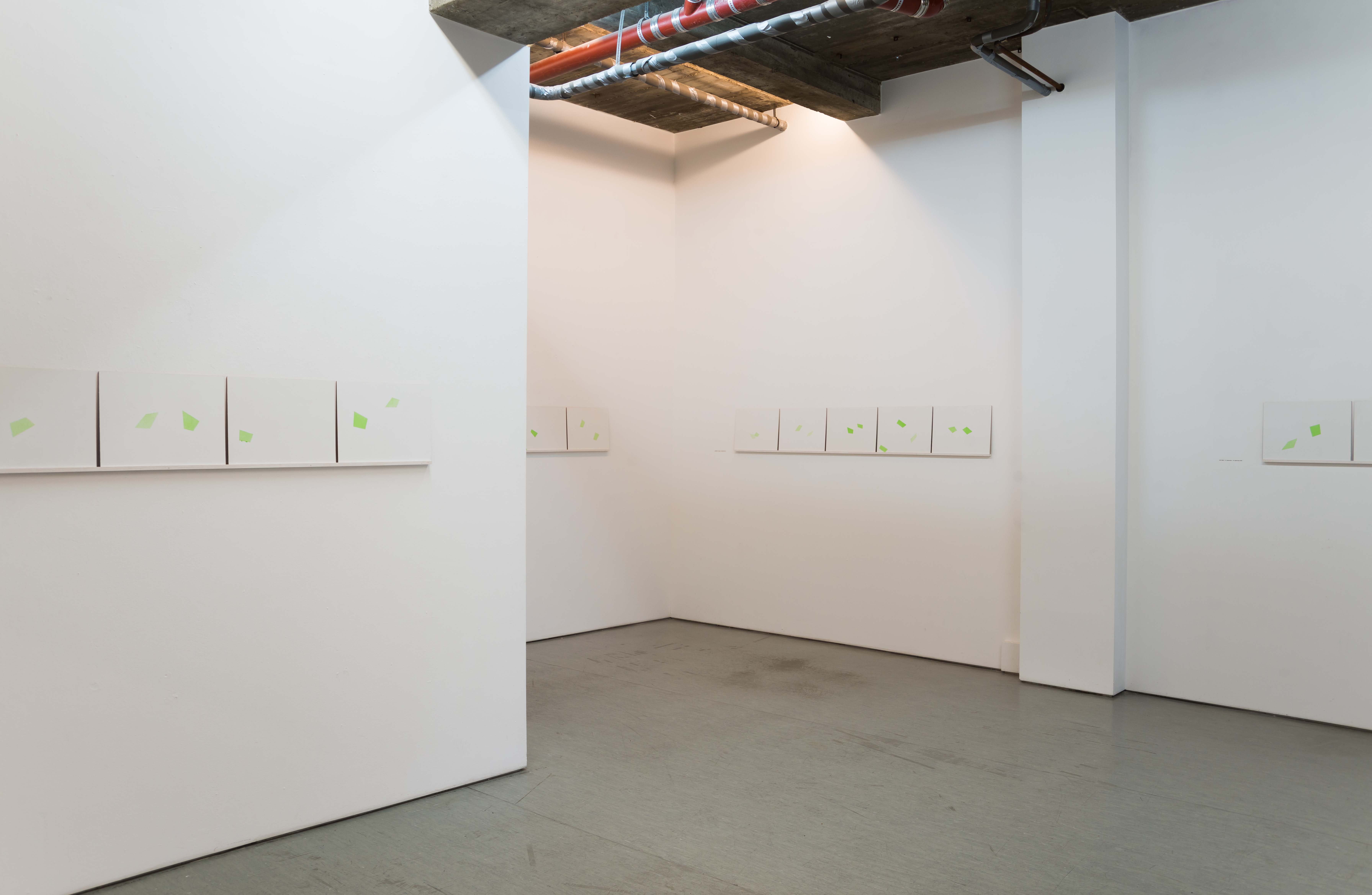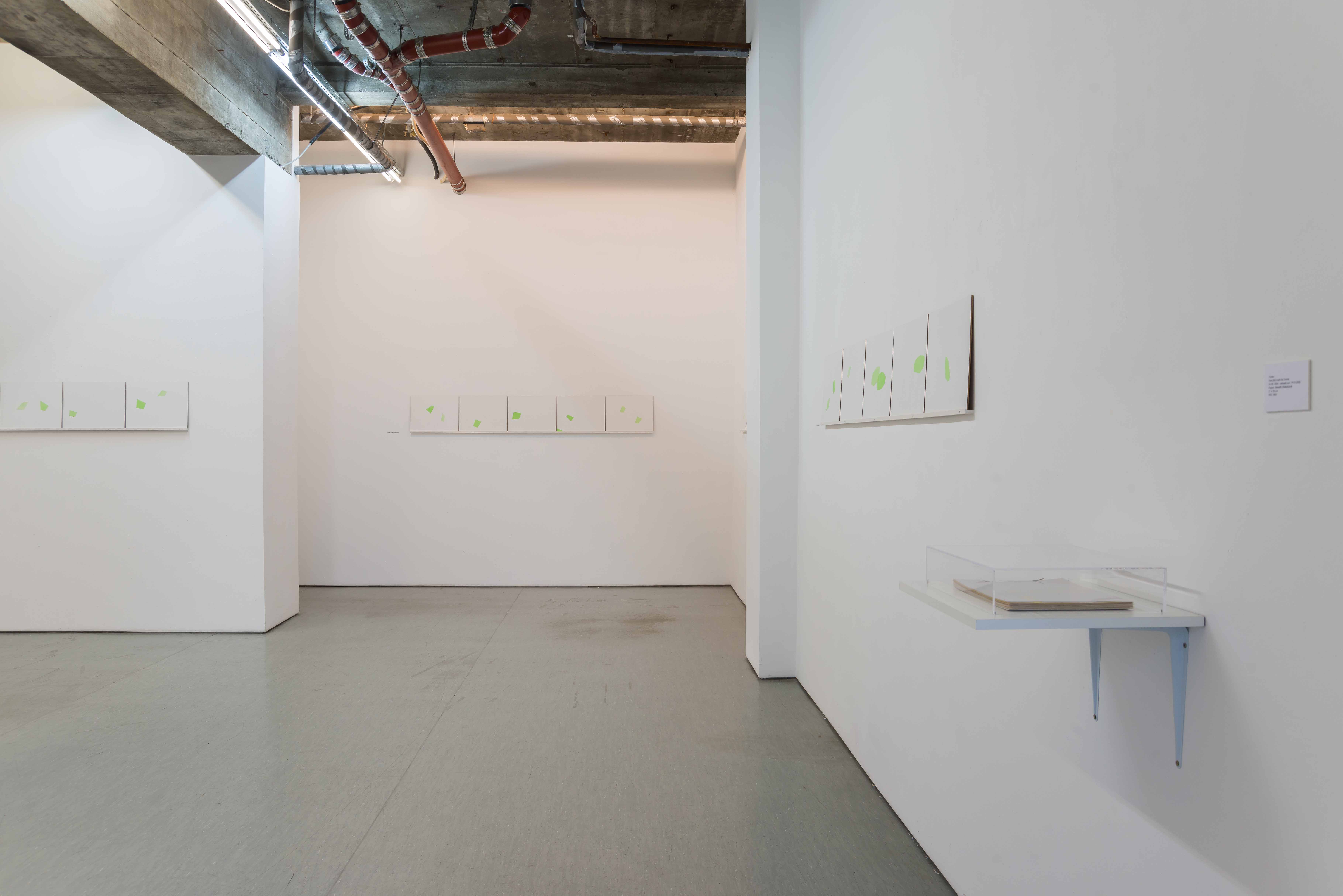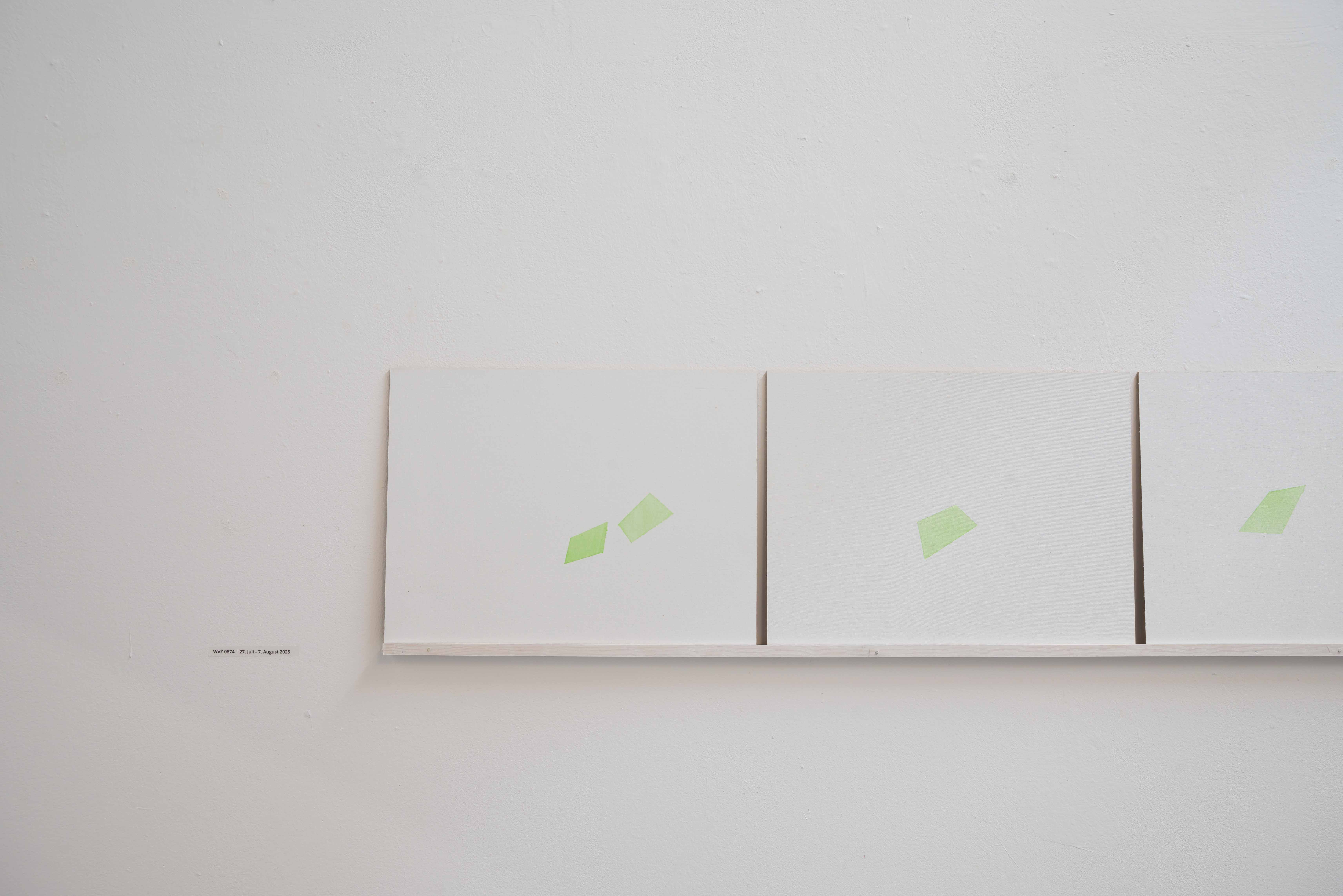 At my studio window in Schönwalde I attached a small round green foil that I cut to size. Since March 2024, 1 have been observing what the sun projects (paints) through this foil onto my canvas walls. 1 first outline the resulting shapes with strips of crepe and then paint them with slightly transparent green paint. 1 note the respective dates and times on the back of the picture. The results are delicate works that shimmer like sunlight. Five chronologically consecutive pictures from the series are archived together in a box, and the series is continually expanded, with 54 pictures having been created by the end of 2024.