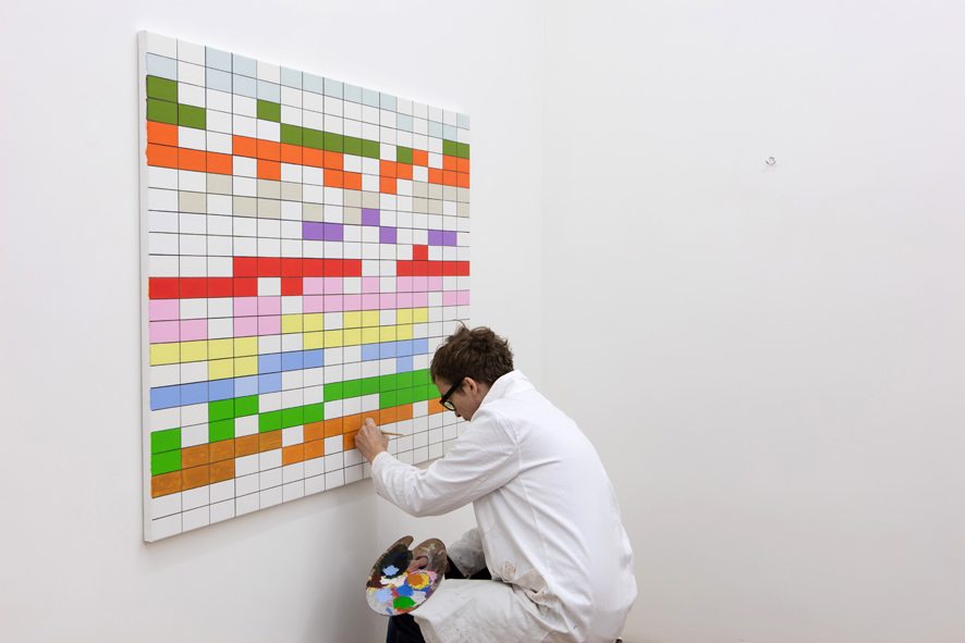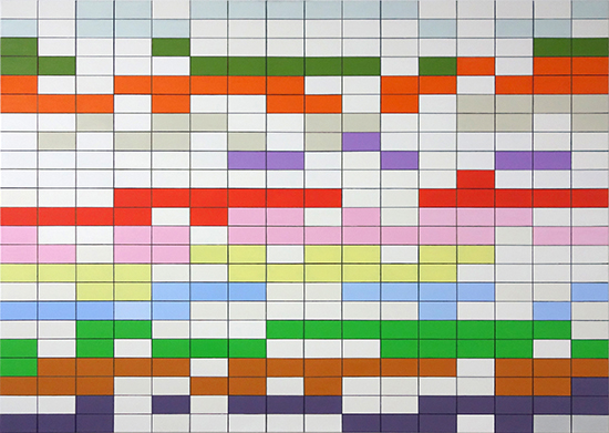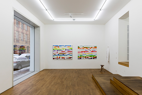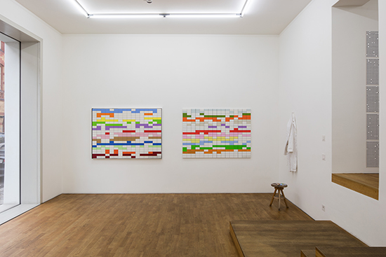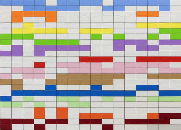 Matten Vogel takes as his topic the artist?s life; his abstract picture is a monumental calendar for 2017, which currently extends as far as 17.3.2017. The work will not be complete until the end of the year. The colored fields indicate the time Vogel spent in his studio, the white spaces stand for other activities. Together they trace his everyday routine: When does he have time for art? And when does he work, so that he can afford this time? Vogel?s calendar addresses a dilemma that extends far beyond his personal biography: Only few people are privileged enough to making a living from their art. Most are involved in a constant balancing act. Vogel addresses this conundrum in his ambiguous work. Whoever buys it, also hangs up on the wall the record of how it came about.