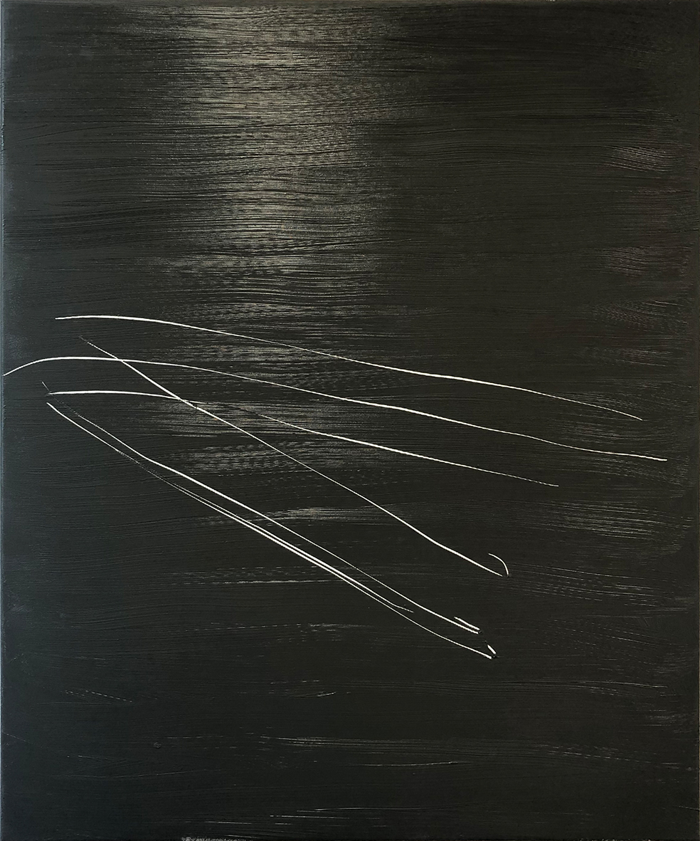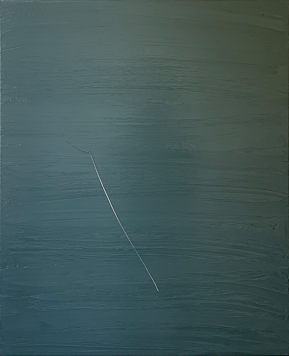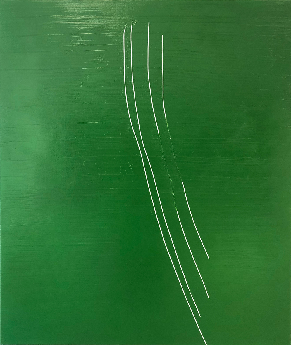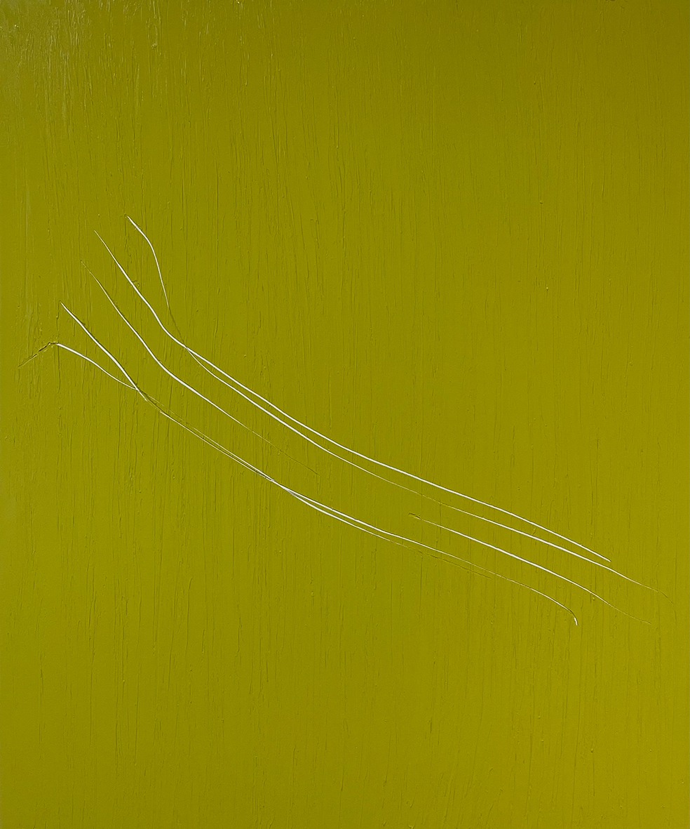 ... Matten Vogel's „Kratzer“ [scratch] pictures, since March 2021, are something of a "role model" for "Üm", if you will. With pens attached to his fingers, the artist strikes at the canvas with spontaneous angry gestures. These quickly and directly executed notations then appear in the form of abstract-impulsive strokes – or scars? – on the canvas. In a second step, the canvas is then covered in paint by the artist, in such a manner that only these strokes remain visible. The images of this group of works, which he calls "risk painting", are tagged with their date of origin, like his Date paintings, and are something like a daily record of the inner anger of the artist, caused not least by the corona pandemic. Like "Üm", the "Kratzer" images are also characterized by the fact that they generate their power in the time-based interplay of attendance and overpainting. The two artistic approaches stand out for their courage to take risks and the willingness to fail productively...