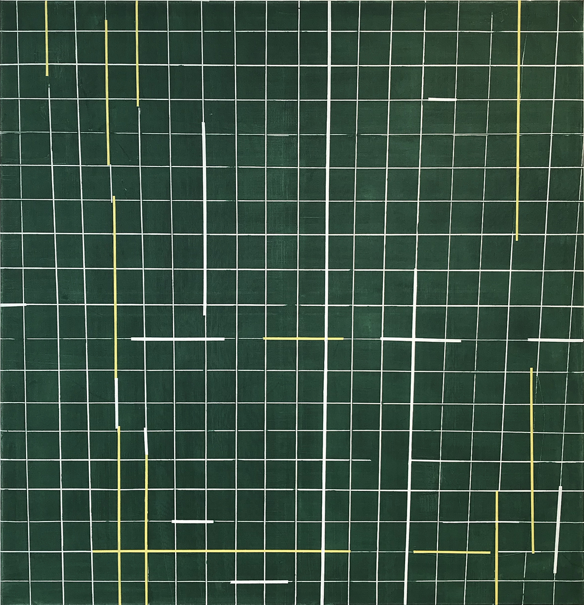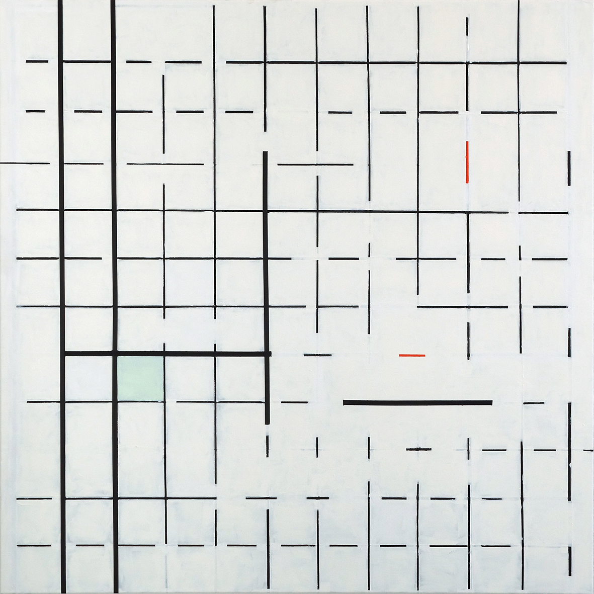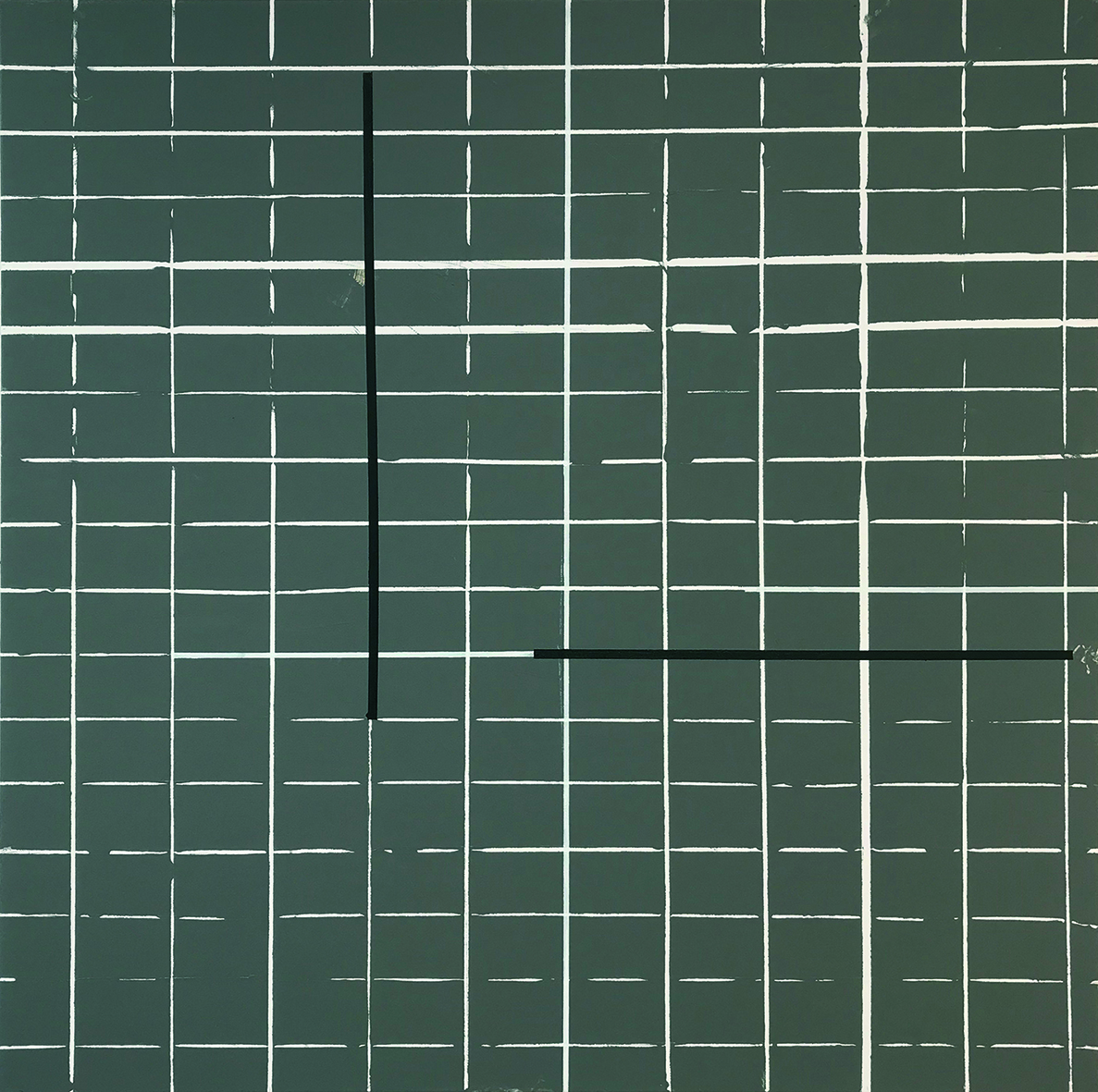 Rasterkorrektur mit hellgrüner Fläche und zwei roten Linien, 20.07. – 26.09.2018 Öl auf Leinwand / oil on canvas, 100 x 100 cm