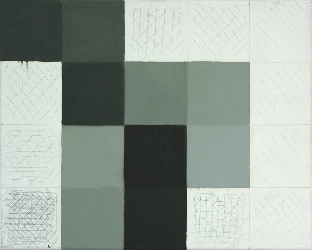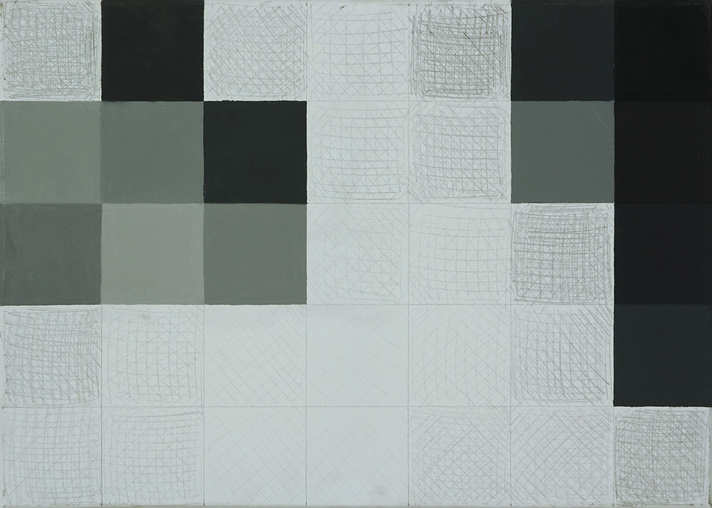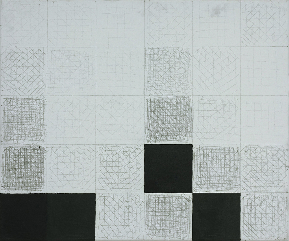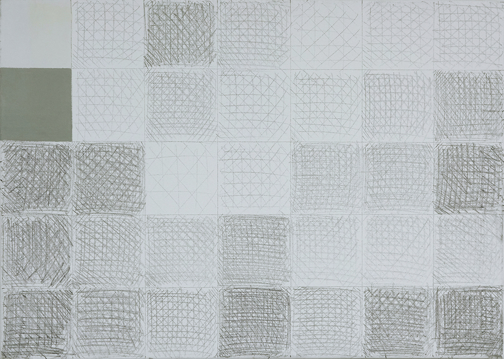 No wonder, then, that the photographs of this situation, with the precise dates and times added, are somewhat reminiscent of documentary photographs of a horrendous crime scene. In Vogel’s work it is often not the end product that is crucial, but his artistic position. In this case it is the completion of the works that is full of tension: Vogel is notified via text message at some point in time that he has to immediately stop working on the painting in question. The artist says no more of the precise way this system works. Yet the arbitrary system is not aware of what state the painting is in when the message is sent – sometimes Vogel has just begun work and has to put the brush down after filling in no more than a single gray square. Upon receiving the text message, Vogel documents the state of the painting and then finishes filling in the last square he has begun painting. The remaining blank space on the canvas is then penciled in with cross-hatching in order to hint at the gray tones Vogel would have painted, had he been allowed to carry on.