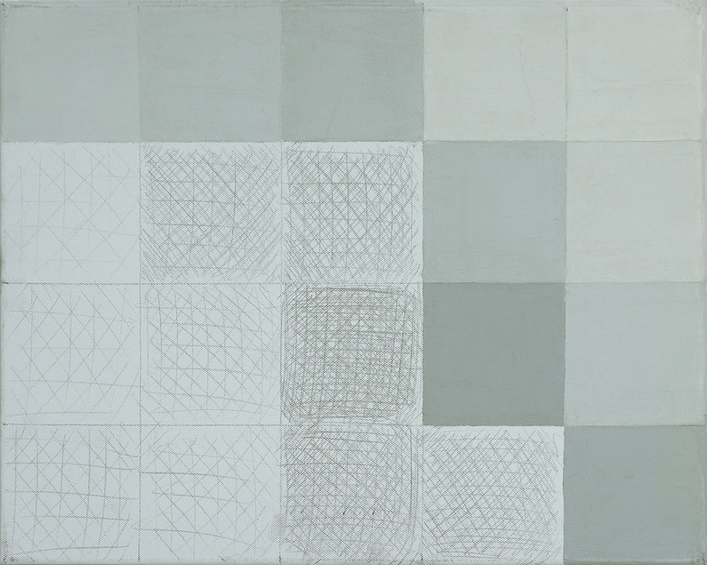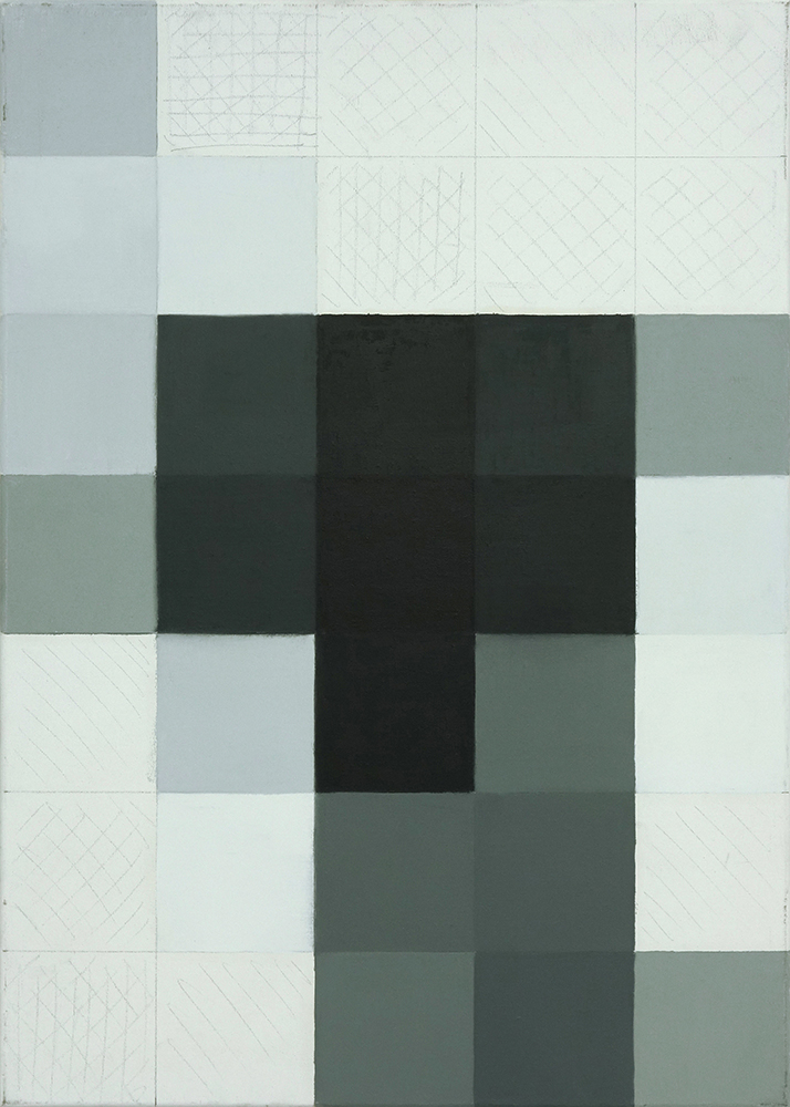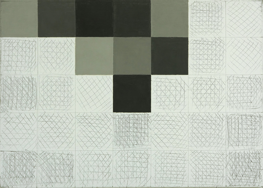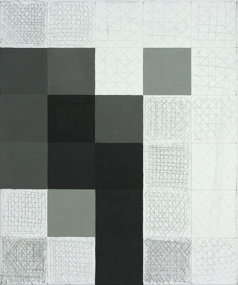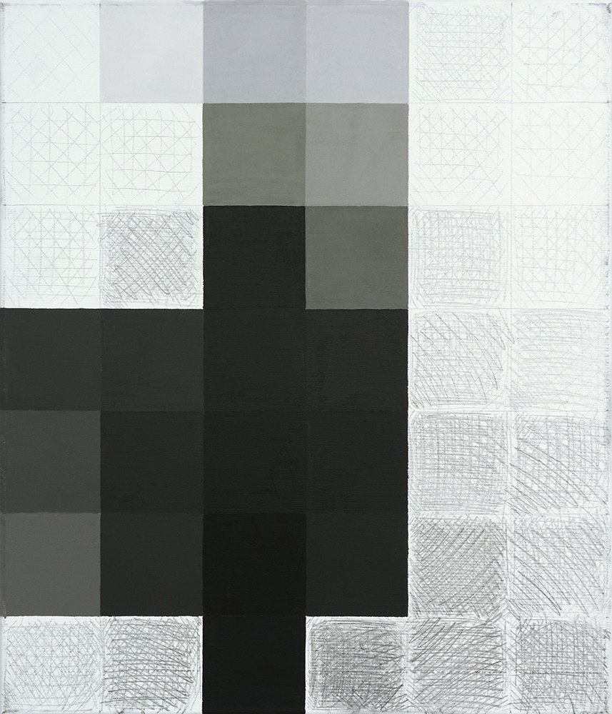 No wonder, then, that the photographs of this situation, with the precise dates and times added, are somewhat reminiscent of documentary photographs of a horrendous crime scene. In Vogel’s work it is often not the end product that is crucial, but his artistic position. In this case it is the completion of the works that is full of tension: Vogel is notified via text message at some point in time that he has to immediately stop working on the painting in question. The artist says no more of the precise way this system works. Yet the arbitrary system is not aware of what state the painting is in when the message is sent – sometimes Vogel has just begun work and has to put the brush down after filling in no more than a single gray square. Upon receiving the text message, Vogel documents the state of the painting and then finishes filling in the last square he has begun painting. The remaining blank space on the canvas is then penciled in with cross-hatching in order to hint at the gray tones Vogel would have painted, had he been allowed to carry on.