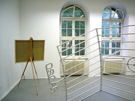 Stips 06, Kunst Raum Kreuzberg, Berlin, 2006 "Staffelei/Über die Unmöglichkeit zu erkennen", 2006 (About) The impossibility to recognize, easels begonnene Ölmalerei auf Leinwand, Staffelei in Raumecke, Maße variabel, Motiv ortsabhängig started unfinished painting on canvas, easel, variable dimensions, motive depends on location