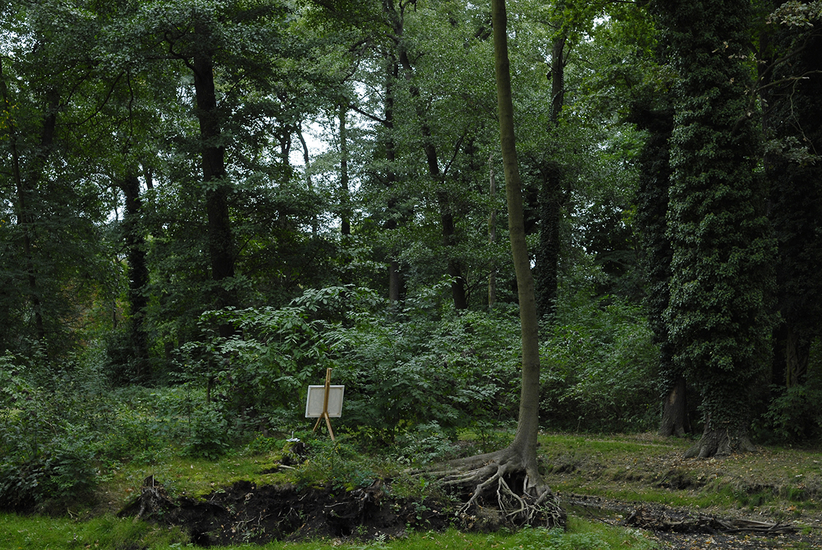 Neue Kunst in alten Gärten, Lehnte, 2006 "Staffelei/Über die Unmöglichkeit zu erkennen", 2006 (About) The impossibility to recognize, easels begonnene Ölmalerei auf Leinwand, Staffelei, Maße variabel, Motiv ortsabhängig started unfinished painting on canvas, easel, variable dimensions, motive depends on location Foto: theMaler.com