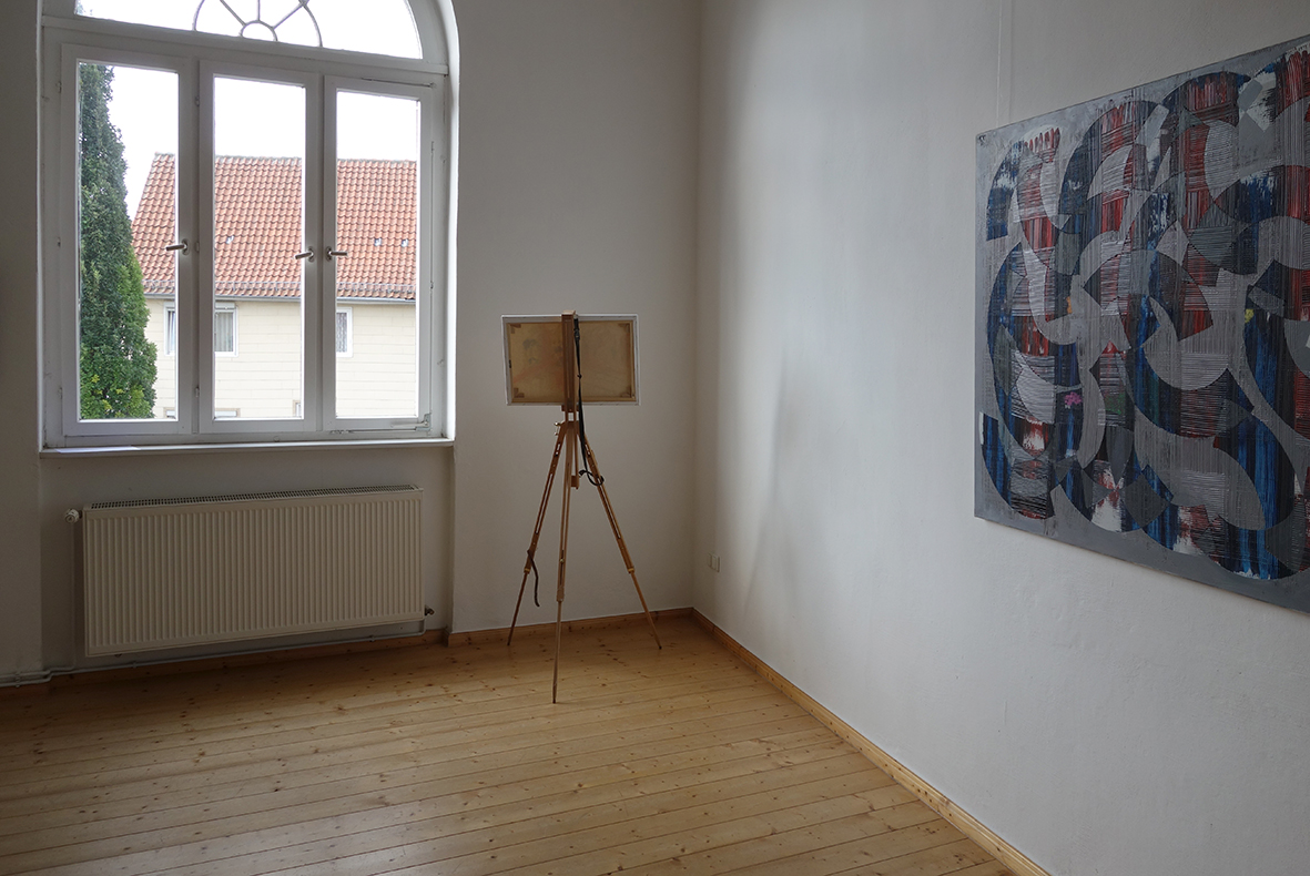 "Staffelei 24082014 / Über die Unmöglichkeit zu erkennen", 2014 (About) The impossibility to recognize, easels begonnene Ölmalerei auf Leinwand, Staffelei in Raumecke, Maße variabel, Motiv ortsabhängig Kunst findet Stadt(d)t, Kunstförderverein Schöningen started unfinished painting on canvas, easel, variable dimensions, motive depends on location